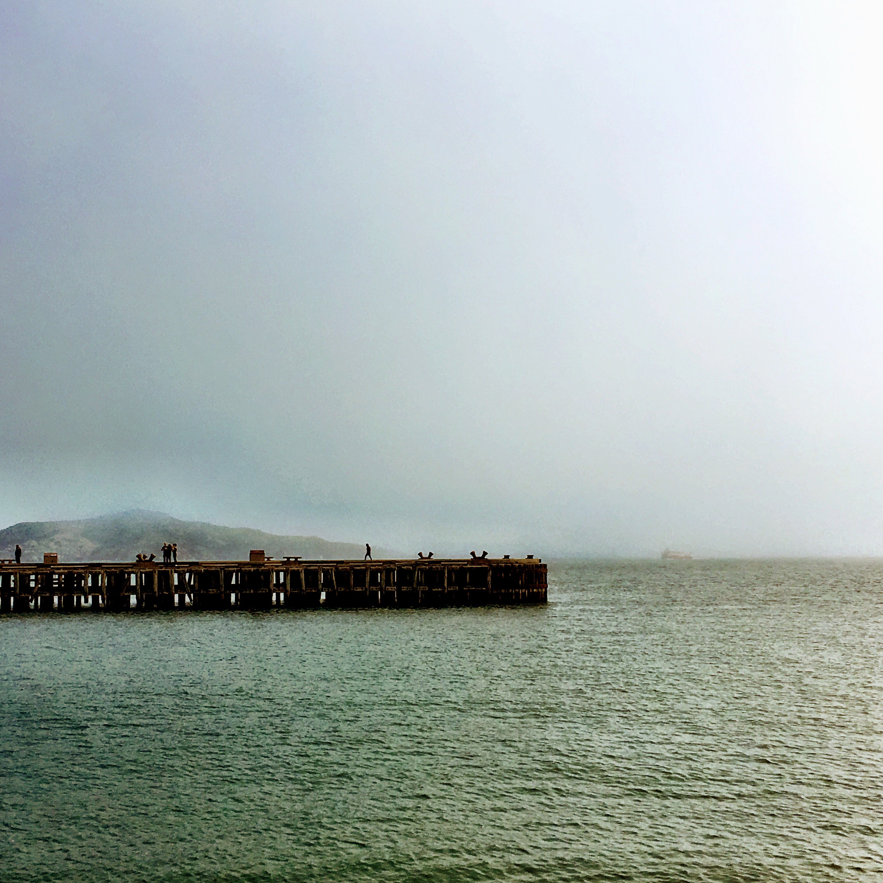 We walked to the end of the pier in silence. I turned my back to Logan and gazed out toward the boat sailing through the thick fog. After a few moments I heard a splash and then some commotion. I turned around and several people were gathered and pointing in the water. I scanned the other people on the pier and I did not see Logan. I rushed over near the crowd of people and there in the water was Logan, swimming away from the pier.