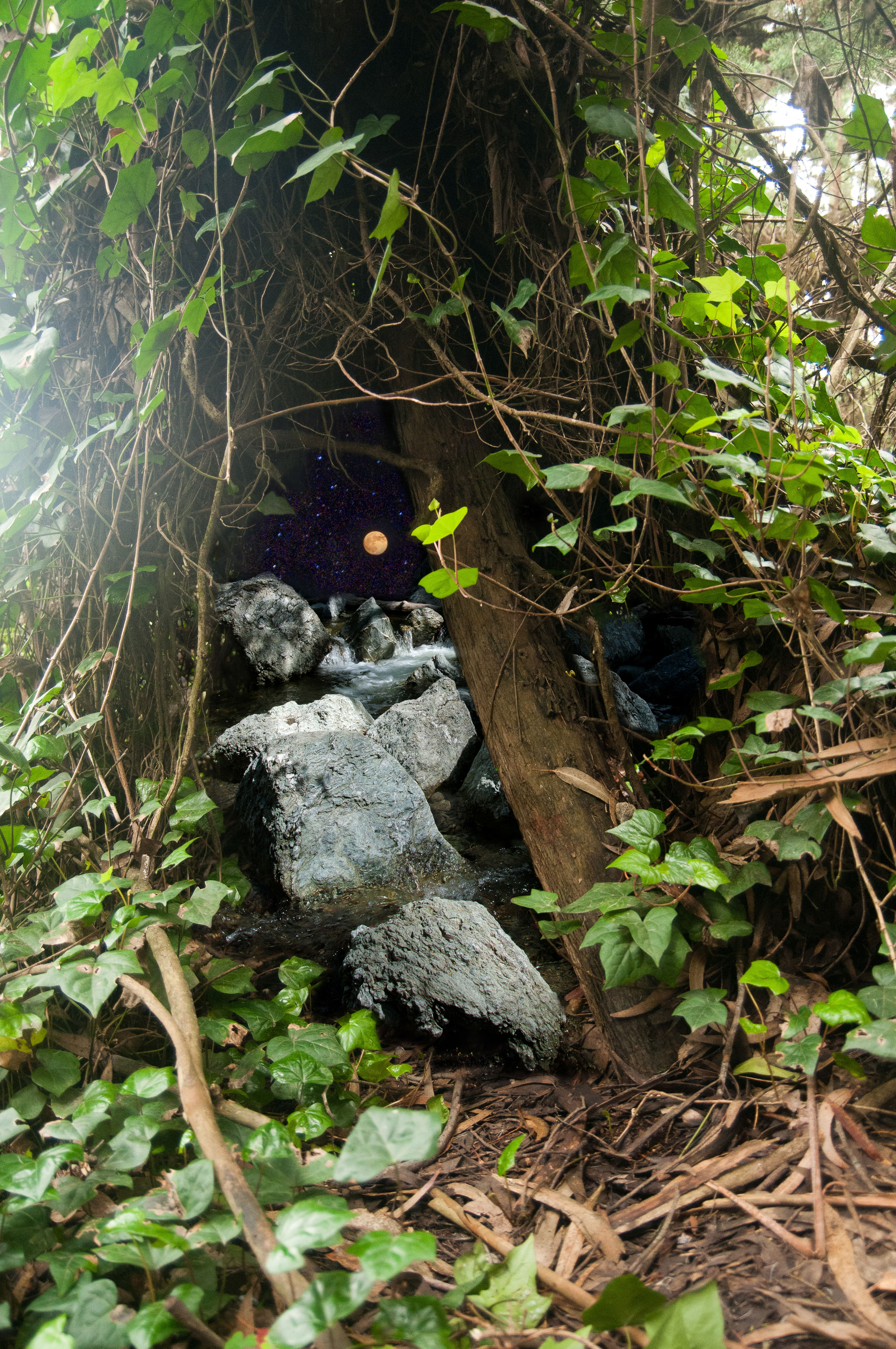 Between ground and tree,